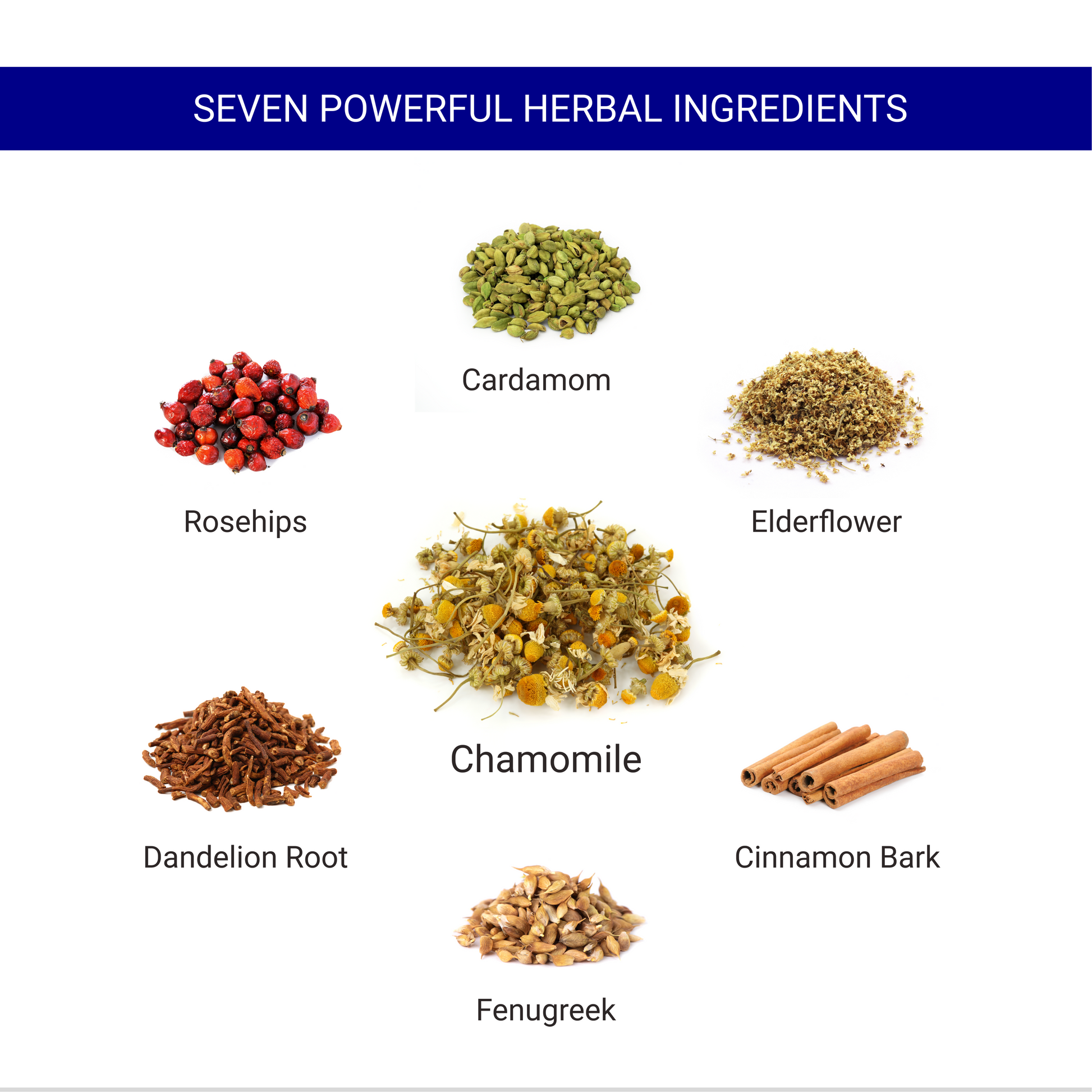 Chamomile, Dandelion Root, Rosehips, Cinnamon Bark, Elderflower, Cardamom, Fenugreek
